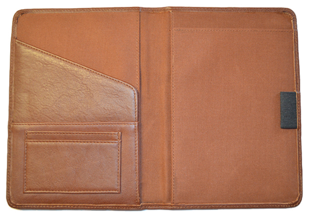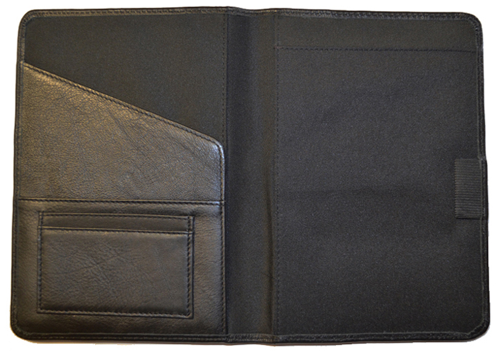 Description: Made from genuine leather. Foam padded and hand stitched cover with turned edges. Inside has a document flap and interior pockets. On the right side of the journal there are both vertical and horizontal slots. Pen slot. Includes a 160 page lined spiral bound journal. Can hold either a letter size pad or an 8 1/2" x 11" notebook.