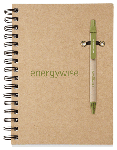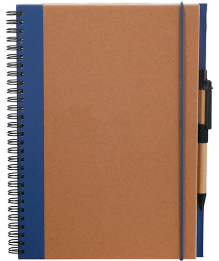 Description: Eco-friendly recycled cardboard journal with pen combo. Ballpoint pen is made from recycled paper/corn starch. The recycled hard cover is made from 70% recycled material. The interior is also made from 50% recycled materials. Elastic pen loop. Includes 80 white ruled sheets. These make for great gift journals to give at any special event.